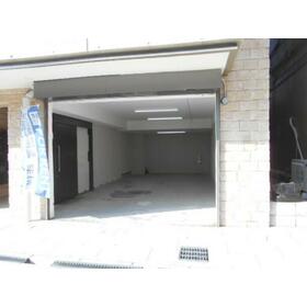 電動シャッター付ガレージ、室内に照明、コンセント有。室内天井高は194~229